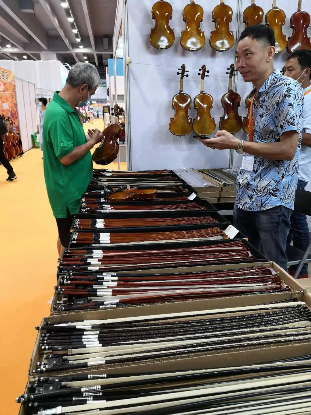 廣州華星樂器行帶來了一些中高端的提琴參展。總經理吳祖亮表示:原來我們的提琴多以出口為主,因為疫情的關系,現在只能走內銷這條路。為此,我們今后要多與專家溝通,在提琴的舒適度方面不斷改進,在提琴的音質、音色方面不斷提升,以滿足國內演奏家的需求。吳祖亮表示,參加廣州樂器展,旨在國外銷售渠道不暢的當下,意欲拓寬國內銷售渠道。他笑著說:"原以為疫情期間展會效果不會太好,沒想到展會人氣很旺,比我預想的要好很多。"這兩天一些顧客到他的展位選購了一些小提琴和大提琴,令他很是欣慰。