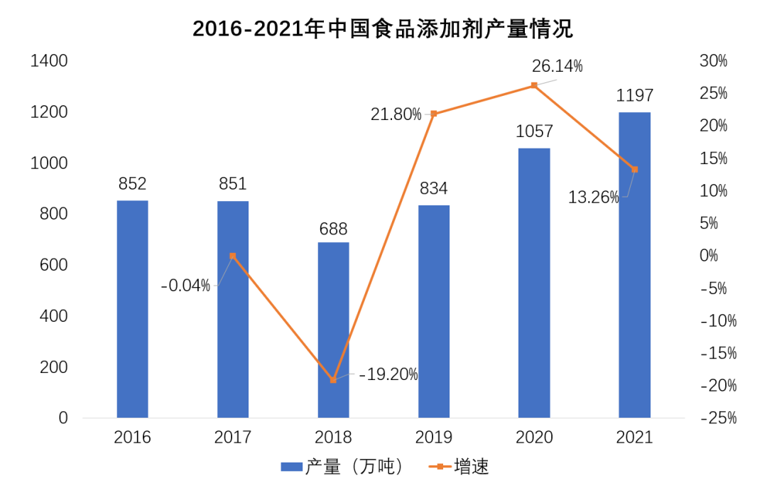 食品添加劑作為現代食品工業的重要組成部分,在市場需求不斷增長的情況下,也得以迅速發展。據資料顯示,2021年我國食品添加劑產量為1197.15萬噸,同比增長13.26%。