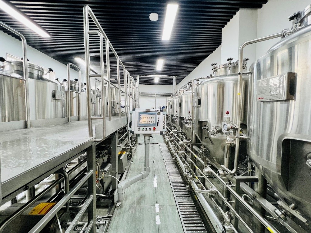 初期,研發(fā)團(tuán)隊(duì)堅(jiān)持高強(qiáng)度學(xué)習(xí),并先后赴十余家啤酒設(shè)備廠、研究機(jī)構(gòu)實(shí)地考察學(xué)習(xí),高效率高質(zhì)量建成了中試車間,打造了一條可進(jìn)行連續(xù)投料、鍋槽互通的300L自動(dòng)化糖化釀造生產(chǎn)線,可實(shí)現(xiàn)煮出糖化、降溫回旋等特殊工序,同時(shí)配備易拉罐自動(dòng)灌裝線、keg桶灌裝線等專業(yè)裝置,為配方開發(fā)及工藝優(yōu)化打下了堅(jiān)實(shí)的基礎(chǔ)。