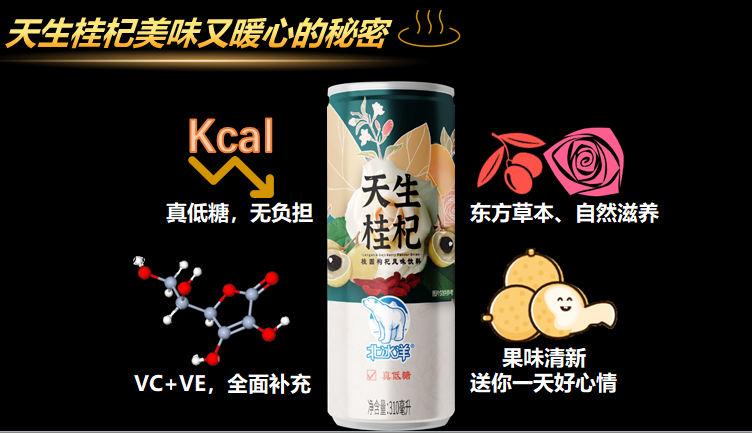天生桂杞是一款集滋補氣血、養生駐顏、補充能量、增強免疫力為一體的暖心飲料。產品從消費者需求出發,原料十分考究。選用烏龍嶺鮮桂圓汁、中寧枸杞、山東平陰玫瑰和古法紅糖等優質天然原料,桂圓、枸杞、玫瑰這樣的神仙搭配除了賦予產品果香清新、花香淡雅的口感外,還具有滋補強體、養心安神、益脾開胃、和血養血、調經等功效。天生桂杞中還添加了能清除自由基、祛斑美白、增強免疫力的維生素E和維生素C。有了這些原料的加持,可以說天生桂杞是一款藥食同源、東西結合、多方位滋養的健康暖飲,無論是可愛的小姐姐還是中年的大叔們都能暢快喝,無負擔,不長胖。