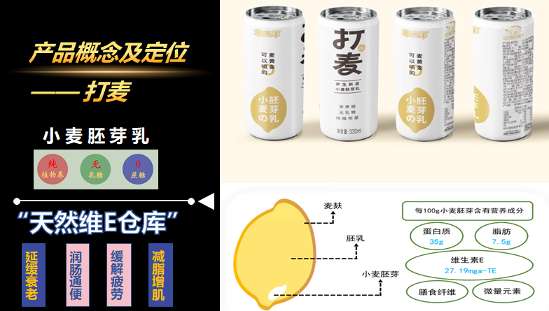 打麥是由小麥胚芽加工而成的植物基蛋白飲品。小麥胚芽是小麥的核心和生命,1000斤小麥才可提取1斤胚芽,經烘培后得到金黃色的小麥胚芽片。小麥胚芽雖然僅占麥粒重量的2%,但營養卻占整個麥粒的97%。因此,小麥胚芽被譽為“人類天然的營養寶庫”,含豐富的維他命E、B1及蛋白質,是高營養的天然食品,具有延緩衰老、緩解疲勞、潤腸通便、減脂增肌的功效。打麥同樣具有0蔗糖,純植物基,無乳糖,低膽固醇、高纖維的特點。作為植物蛋白飲料,打麥的主要消費群體定位為動物保護主義者、素食主義者和乳糖不耐受人群,對于加班族、健身和塑身人群,老年人也非常適合。